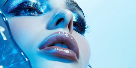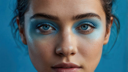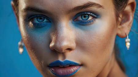 Close-up of a woman with bold blue eye makeup, dramatic eyeliner, and glossy lips against a vibrant blue background, highlighting a glamorous and confident look. High quality photo