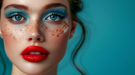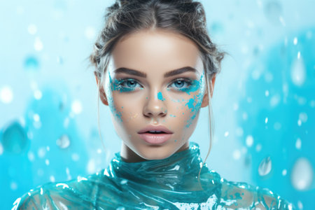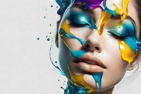 face of a young woman with clean beautiful skin with stylish makeup and full of colorful splashes of cosmetics and blue cream, by ai generative