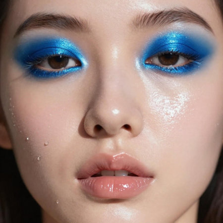 portrait of a woman’s face, wet, with glistening skin that reflects soft studio lighting, glossy, electric-blue metallic eyeshadow extends dramatically across her eyelids.