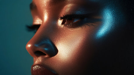 A striking portrait of a woman with glowing skin, illuminated by vibrant lighting, highlighting her features and the moisture on her face.