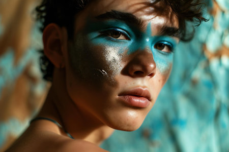 A striking portrait showcases a person with artistic face paint featuring bold colors. The intricate design emphasizes bright blue, orange, and gold, enhancing the subject's captivating expression.