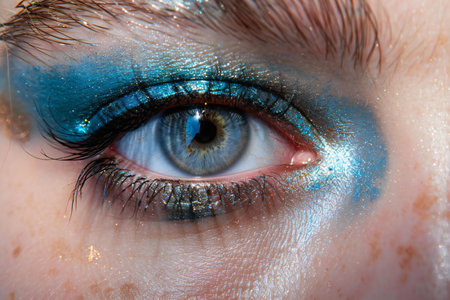 This image features a stunning close-up of artistic makeup highlighted by blue glitter and gold speckles. It captures the intricate details of beauty and expression.