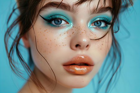 Close-up portrait of beautiful young woman with blue eyeshadow
