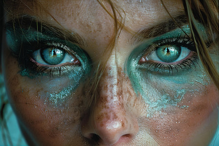 Closeup of freckled woman with intense blue eyes and bold glitter makeup in a dramatic fashion portrait.