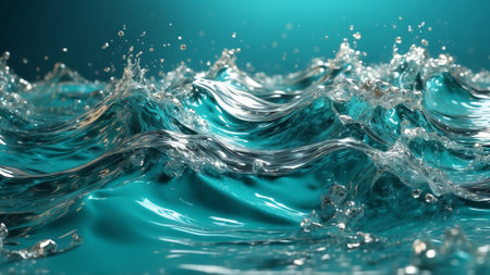 Serene digital artwork capturing fluid turquoise waves and subtle luminous effects, conveying tranquility and refreshment through elegant artistic rendering. Perfect for commercial applications in wellness branding, travel marketing, app interfaces, and eco-product visuals, appealing to designers seeking versatile, modern graphics. Its soothing palette and dy... AI-generated digital illustration. AI-generated illustration.