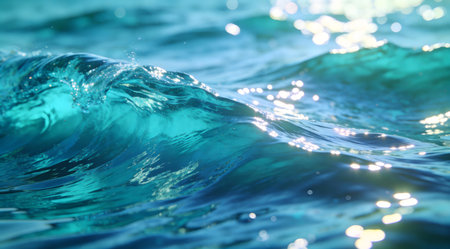 A creative digital illustration depicting Vibrant turquoise ocean wave abstract background, shimmering surface highlights, refreshing and dynamic mood, commercial digital art style. This AI-generated artwork features unique visual elements suitable for various commercial and editorial applications. AI-generated illustration.