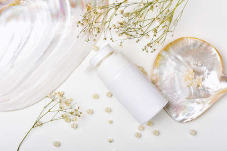 Cosmetic bottle containers with marine pearl extraction essence, Blank label for organic branding mock-up, Natural skincare beauty product concept.