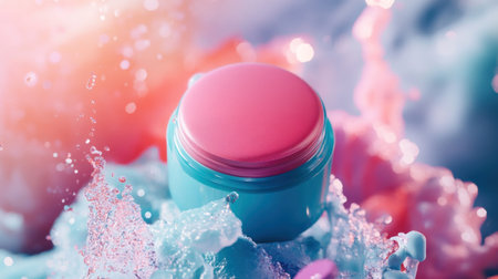 Visually striking close up of a cosmetic product bottle with a pink and blue color scheme surrounded by a dynamic splatter of liquid and vibrant reflections creating an and creative product image