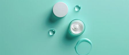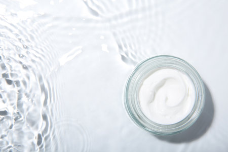 Beauty cream jar and bright light blue water. Moisturizing beauty cream, skincare and spa cosmetics. Top view and copy space