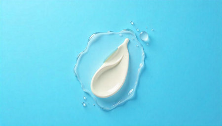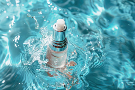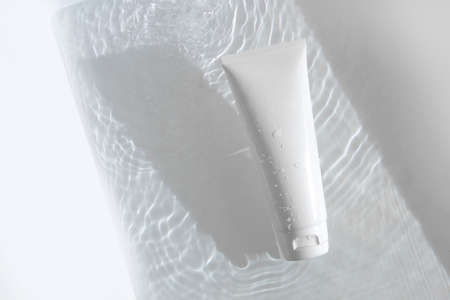 Cosmetic sunscreen product on blue water surface with splashes and drops. Body care health concept.