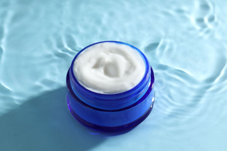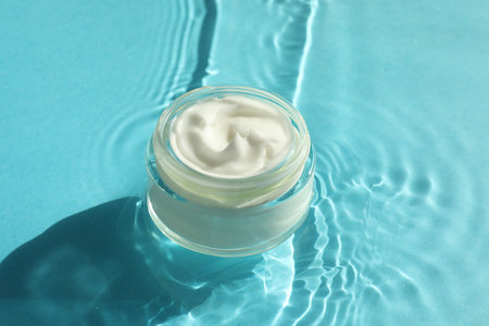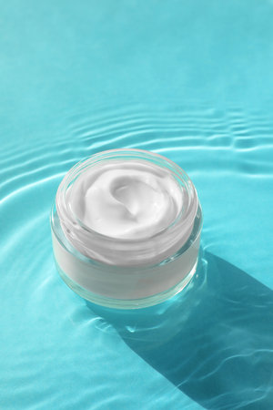 Jar of cosmetic cream over blue water background, copy space. Moisturizing beauty cream. Natural beauty, skin care and spa concept.