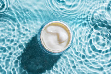 Jar of cosmetic cream over blue water background, top view. Moisturizing beauty cream. Natural beauty, skin care and spa concept.