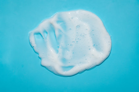 White lather foam moisturizer cream lotion cleanser on blue background. Beauty sudge smear mockup