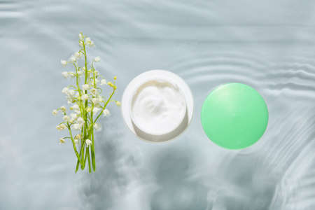 Jar of cream and lily-of-the-valley flowers into water on gray background