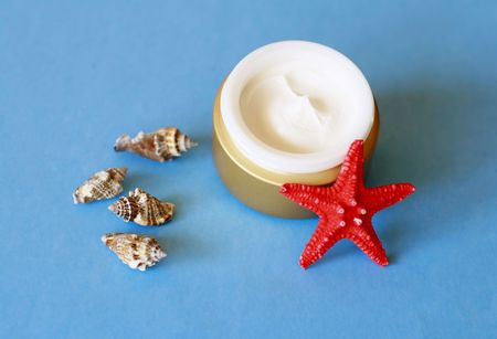 Spa product, organic skin care and natural emulsion concept - Sensitive skincare moisturizer beauty face cream on water and sea shells background, luxury anti-age cosmetics