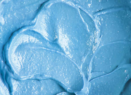 Blue cream, moisturizer, shampoo spread, sunscreen cosmetic smear background. Moisturizing beauty creme, balm swatch, paint texture. Creamy fluid skincare lotion mousse product closeup.