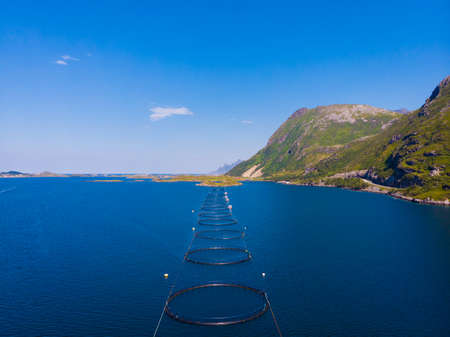 Salmon fishing fish farm on the sea in Lofoten islands Norway.