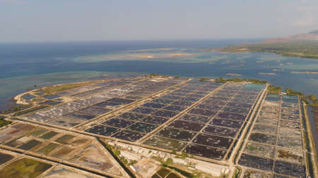 shrimp farm, prawn farming with with aerator pump oxygenation water near ocean. aerial view fish farm with ponds growing fish and shrimp and other seafood. Fish hatchery pond aerial view aquaculture business exported international market. java, indonesia