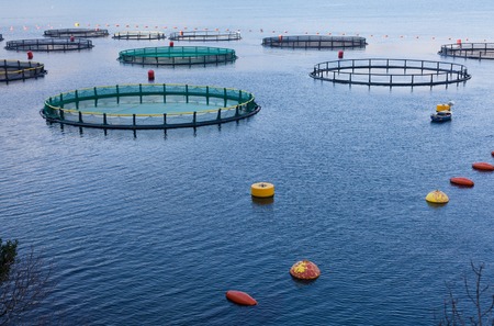 Large fish farm with lots of fish enclosures