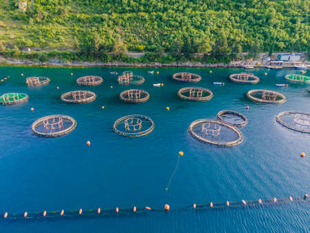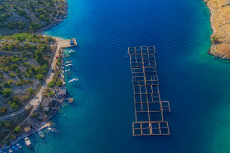 Aerial shot of Aquaculture sea fish Floating farming cages, offshore marine seafood industry in Adriatic Sea. Salmon.