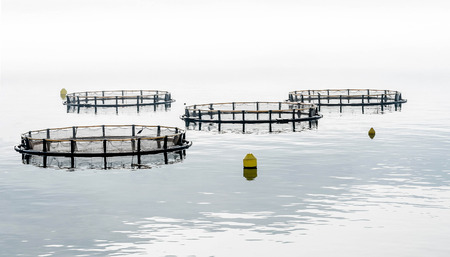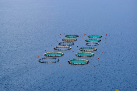 Circular marine net pens used for commercial fish farming, floating in calm ocean water. Aquaculture method utilizes floating enclosures to contain fish while allowing natural water exchange