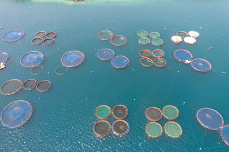 Aerial top down view over a fish farm with lots of fish enclosures on cages. fish farm aquaculture and industry