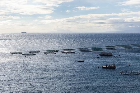 Overview of a fish farming in the Aegean Sea on the coast of East Attica in Greece