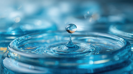 A stunning close-up of a water drop falling and creating ripples on a calm surface. The blue tones and reflections evoke a sense of tranquility and elegance.