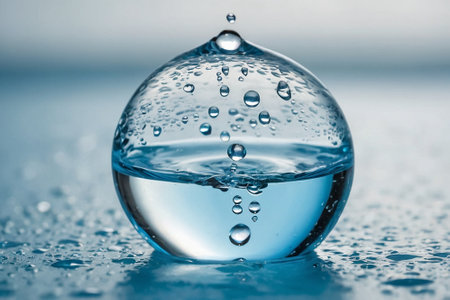 Close-up of a water drop on a serene blue surface, capturing a sense of purity and freshness. Ideal for conveying themes of nature, science, or tranquility.