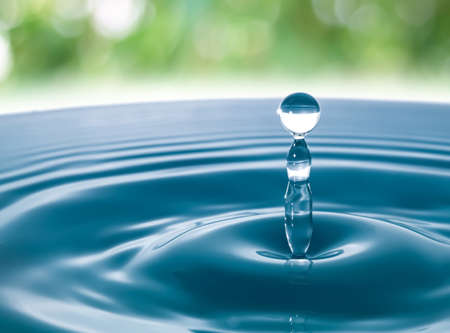 Water droplet impacting still water, creating concentric ripples and a splash.