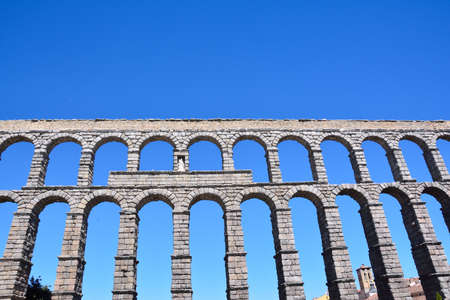 The picturesque part of the historic aqueduct in Spain against the blue sky.