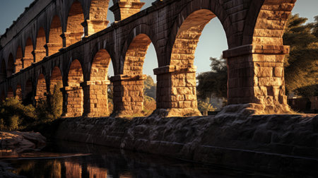 Roman aqueduct's water flowing through graceful arches casting shadows