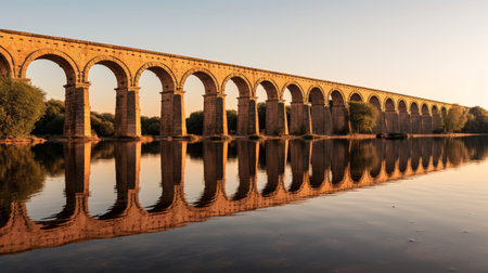 Roman aqueduct's reflection in tranquil lake creating mirror image