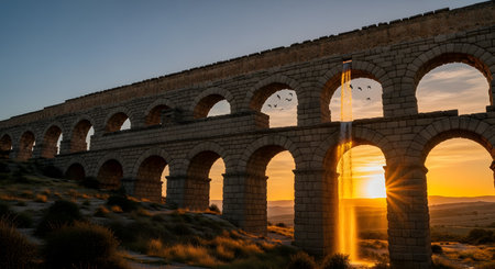 Roman aqueduct's monumental arches in sun-drenched countryside