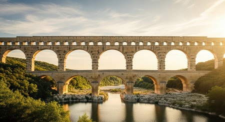 Ancient roman aqueduct over river at sunset surrounded by lush greenery