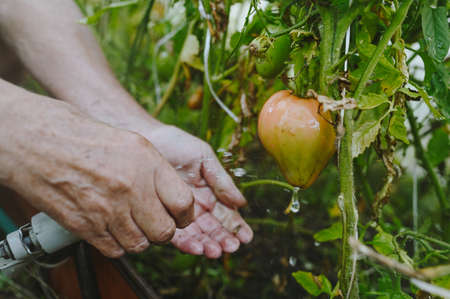 Elderly senior hands watering plants with hose in garden greenhouse. Drops of water on unripe tomatoes. Farming, gardening, agriculture, old age people. Farmer growing organic vegetables on farm.