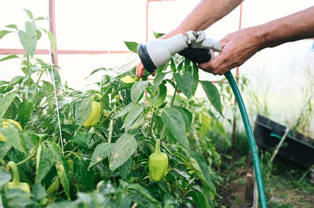 Elderly senior hands watering plants with hose in garden greenhouse. Drops of water on unripe bell peppers. Farming, gardening, agriculture, old age people. Farmer growing organic vegetables on farm.