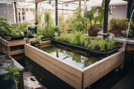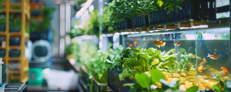view of aquaponics and hydroponic system, with fish swimming in tanks and plants growing, created with generative ai