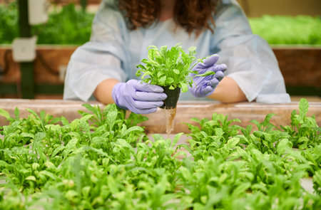Woman gardener standing by shelf with lettuce seedlings in greenhouse. Close up of woman hands in sterile garden gloves holding pot with green leafy plant.