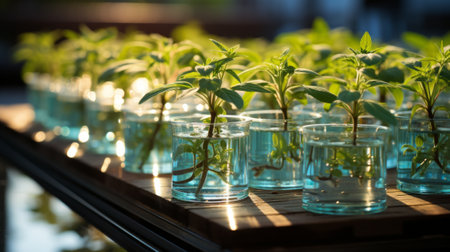 Plants in glass bottles in the laboratory. Biotechnology concept.