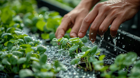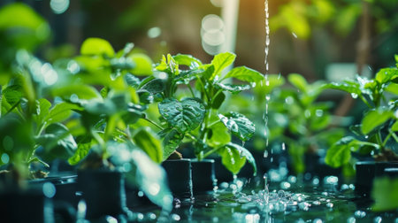 This captivating image shows vibrant green plants emerging from water, with splashes of droplets highlighting growth and freshness in a tranquil outdoor environment.