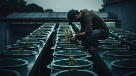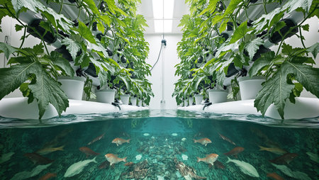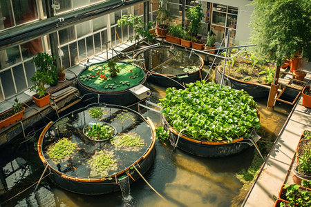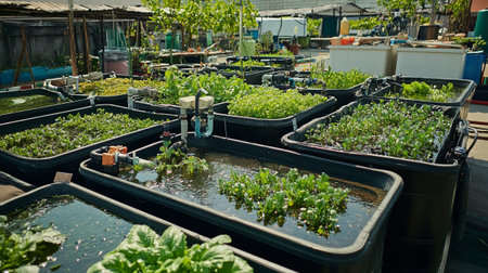 innovative aquaponics farm system, showcasing fish tanks and hydroponic vegetable beds in harmony.