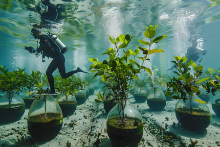 A team of marine biologists plants and maintains underwater gardens, fostering biodiversity and conservation.