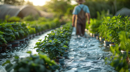 Gardening in a greenhouse with water plants and sun light in the morning