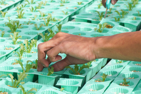 farmer putting hydroponic vegetable sprout on wet sponge on Hydroponic rail pipe in plant nursery. lettuce salad growing from seed in farm.