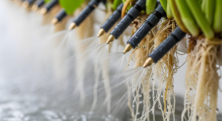 A close-up view of an aeroponics system, a method of indoor farming, where nozzles spray a fine mist of water and nutrients directly onto the exposed roots of plants. This advanced agricultural technology allows for soilless cultivation and efficient resource use, representing the future of farming.
