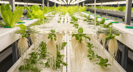 A close-up view of a modern hydroponic farm where fresh green lettuce and basil plants are growing without soil. The plants are set in trays with their healthy white roots submerged in nutrient-rich water. This image represents sustainable agriculture, vertical farming, and innovative food production technology.