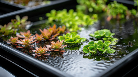 close-up of aquaponics system, showing fish swimming and plants growing, created with generative ai