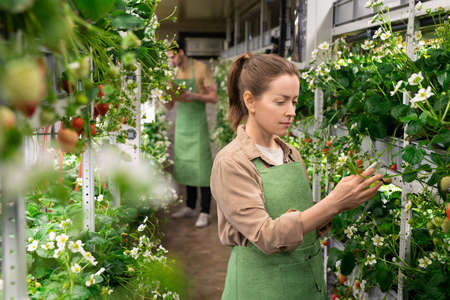 Female in apron working in a garden against young male farmer