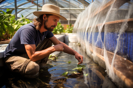 A male farmer who owns a hydroponic vegetable garden is checking the quality of water used for growing vegetables, maintaining a quality and non-toxic hydroponic garden.